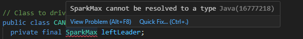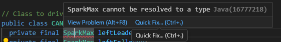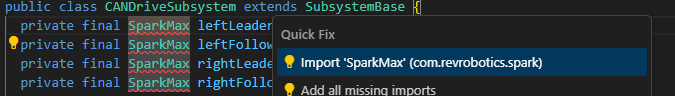- If you are using other motor controllers, replace SparkMax with Talon, TalonSRX, Victor, or VictorSP in the code you write depending on the type you use.